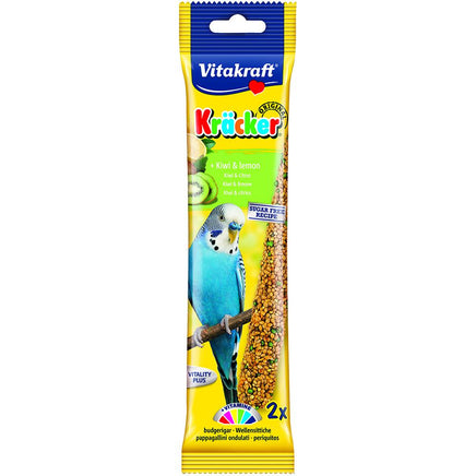 Vitakraft Budgie Kracker Sticks complete pet food for budgies with added vitamins triple baked with a natural wooden stick & clip holder. Enriched with delicious fruity flavour, these Vitakraft Budgie Kracker Sticks contain tasty Kiwi and Lemon, a firm favourite providing natural citrus and sweetness birds love.
