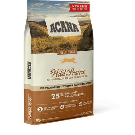 Cats biologically require a diet rich in protein from whole animal ingredients. Inspired by our vast prairies and pristine lakes, ACANA Wild Prairie offers your cat quality animal ingredients from free-run chicken and turkey, freshwater fish, and cage-free eggs. Protein-rich and nutrient-dense, ACANA includes WholePrey ratios of meat, organs, cartilage, and bone, so your cat is getting everything they need for peak health, keeping them happy, healthy, and strong.