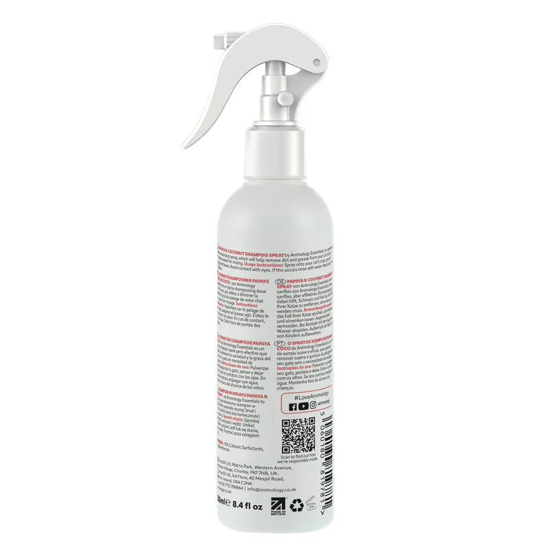 Papaya & Coconut No Rinse Shampoo Spray by Animology Essentials, the perfect solution for keeping your cat's coat clean and fresh without the hassle of rinsing.