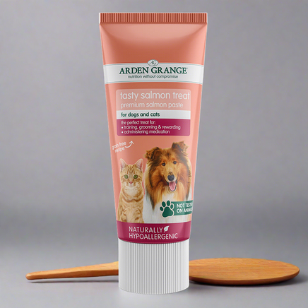 Tasty Salmon Treat is a highly palatable paste which is a perfect reward or training aid for dogs and cats. It is also a great way of giving medication, either mixed in with a crushed tablet or with liquid medications on a dish, and is an excellent aid when grooming.