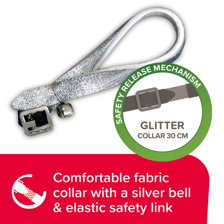 - COMFORTABLE FABRIC COLLAR WITH A GLITTER FINISH: optional silver bell also included
