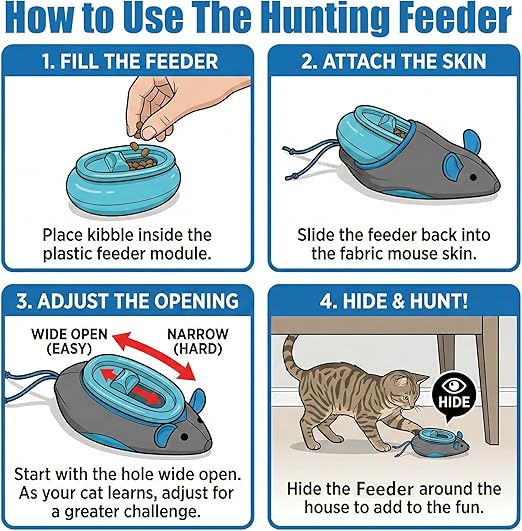 Indoor cat no bowl feeder - get rid bowls and allow them to hunt! Interactive hunting system - boredom buster - 3 mice twice a day Improve your cat's behaviour - encourage their natural instincts No more Night time waking Helps prevent scarf & barf, the system helps your pet maintain a healthy weight.