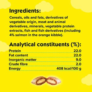 Composition: Meat and Animal Derivatives, Cereals, Oils and Fats, Derivatives of Vegetable Origin, Vegetable Protein Extracts, Fish and Fish Derivatives (including 4% Salmon in the Orange Kibble and including 4% Tuna in the Brown Kibble), Minerals.