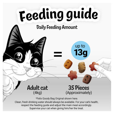 Daily Feeding amount for a 4kg cat is 13g or approx. 35 pieces. Clean, fresh drinking water should always be available. For your cat's health, respect the feeding guide and adjust your main meal accordingly. Supervise your cat when giving him/her the treats.