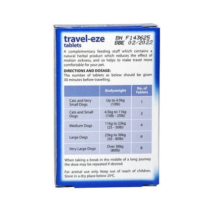 Travel-Eze Tablets for Cats and Dogs by Johnson's contain a natural herbal formula which reduces the effect of motion sickness in cats and dogs.