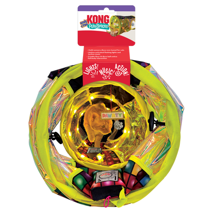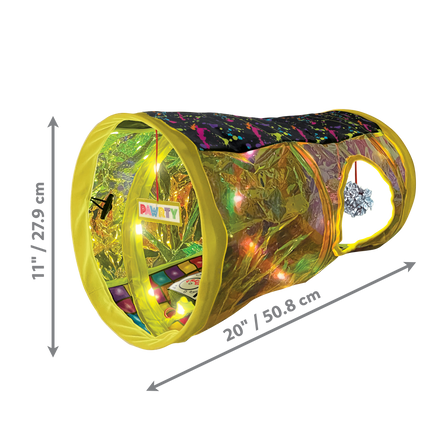 KONG Play Spaces Rave Cave brings the fever to your cat’s Saturday nights – or any night or day! The crackling floor entices full-body kitty breakdancing, as motion-activated 90s techno beats start pumping and retro lights begin flashing, enticing your cat’s multiple senses. A shiny disco ball hangs from the ceiling, inviting batting & boogying. When the party’s over, easily fold up this tunnel and pack it away until it’s time to drop it like it’s hot again. Energetic cats will love this interactive tunnel for batting, stalking, pouncing, and partying. On/off switch gives kitties an option for silent and dark disco nights.