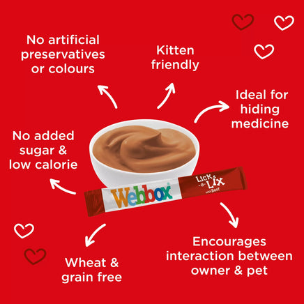 Made with a soft yoghurt like texture, Webbox lick e Lix with Beef is totally the unique treat for your cat. Feed as a tasty treat, use as a topping or disguise crushed up tablets for your cat. These tasty and nutritious sachets make the perfect daily treat that your cat will simply adore!