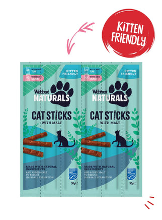 Introducing an all natural version of the extremely popular Webbox Cat Sticks! A delicious duo of MSC Salmon with malt MSC Tuna with malt which is great for hairball prevention , making these sticks the perfect tasty treat for your purring companion.