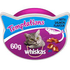 WHISKAS® TEMPTATIONS™ are delicious dual-textured cat treats containing a scrumptiously soft, creamy centre with less than 2 kcal in every treat. Purrrr!WHISKAS® TEMPTATIONS™ with Salmon flavour. For adult cats, 90g pot.Complementary pet food for adult cats.