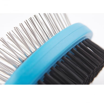 To use, begin with the pin side and gently brush the hair in the direction of the fur growth. The pins are rounded for comfort and will pull loose hairs from the coat and undercoat. To ensure your dog has an enjoyable grooming session, do not push the brush into the dog's skin. Gently tease out tangles with the brush. Do not pull or tug on matted fur; this may require cutting. When all tangles are removed use the bristle side of the brush to smooth the top of the coat. Pause or end the grooming session if your dog becomes agitated.