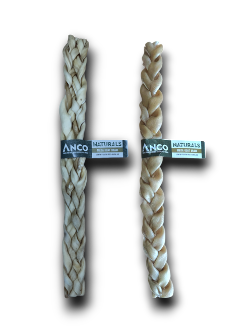 Calling all super chewers for - one of Anco's largest treats - Mega Braids. If your dog is already a fan of our braids, there's nothing much better for them that these. Super long lasting, these are excellent for those enthusiastic chewers. Goat in particular is really good for those with common protein allergies/intolerances or food sensitivities as it is hypoallergenic. Therefore it'll be gentle on even the sensitive tummies. *Approximately 40-50cm* Please note – Anco Mega Braids may come looking like either displayed in the product image. Mega Braids are based on weight, anything above 145g is classed as a Mega Goat Braid.