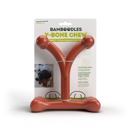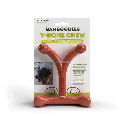 Our Bamboodles ‘Y-Bone’ is tough. The natural strength of bamboo fibre combines with nylon fibres to create a longer-lasting, durable chew toy - suitable for all dogs, including those more aggressive chewers.