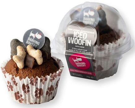 A single Carob Iced Carob Woofin, something really pawsome. made to share or for the larger of our furry friends...our light and fluffy sponge, topped with a tail-swishing swirl of famous yoghurt frosting and decorated with crunchy bone and edible disc.