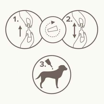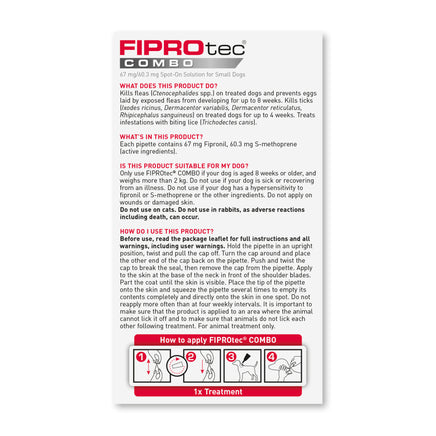 ALWAYS FULLY READ THE PRODUCT LEAFLET AND PACKAGING BEFORE USE. Do not remove the pipette from the sachet until you are ready to use the product. Weigh your dog carefully before application to ensure they weigh between 2–10kg. If your dog weighs more than 10kg, please use the Medium Dog pack. 1. Hold the pipette in an upright position, twist and pull the cap off. 2. Turn the cap over and use the other side to break the pipette seal by pushing down and twisting the cap. 3. Part your dog's fur between the shoulder blades and place the tip of the pipette onto the skin. 4. Squeeze the pipette several times to empty its contents completely and directly onto the skin. Do not allow children to play with your pet until the fur is fully dry. For continuous protection, reapply Beaphar FIPROtec® COMBO for Small Dogs every four weeks.