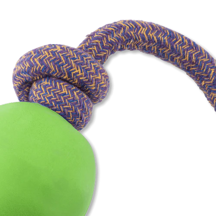 Going the distance to keep your dog leaping to the sky. A natural rubber ball on a strong and soft-to-touch recycled cotton rope. The natural rubber is super tough, and the rope makes it easy to throw; ideal for a game of fetch