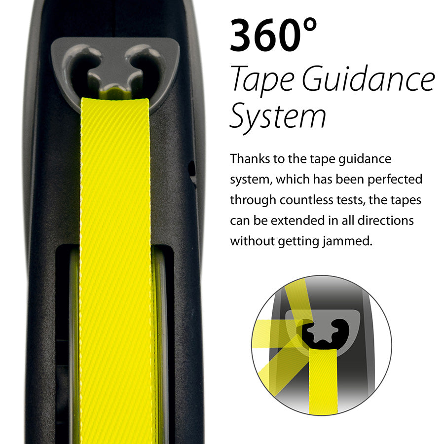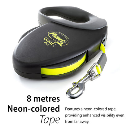 An 8m neon tape lead for dogs up to 50kg, offering visibility, single-handed brake control, and a jam-free tape guidance system.
