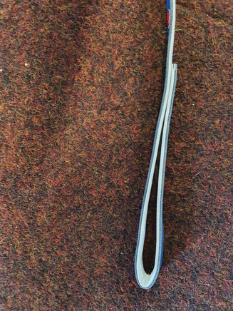 Blue Leather look material on one side with 5 floral daisy motifs near handle