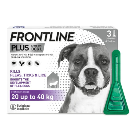 • FRONTLINE PLUS® is a topical treatment which is applied to your dog’s skin to kill fleas and ticks through contact – meaning they don’t have to bite your dog to be killed