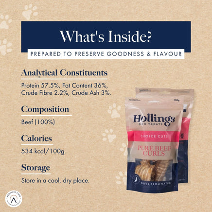 - GRAIN FREE, JUNK FREE & SINGLE SOURCE OF PROTEIN - Hollings Beef Curls are grain free and do not contain any artificial colours, flavours or preservatives or any added sugars. These meaty treats are also a single source of protein for your dog.
