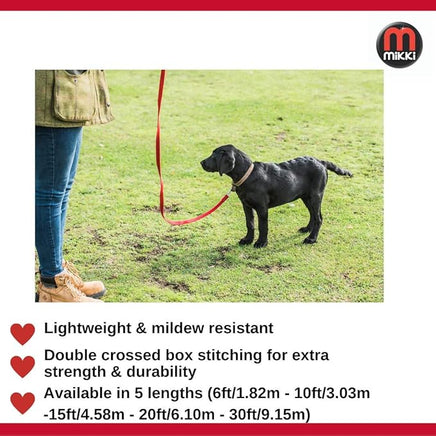 Double crossed stitching for extra strength & durability. Ideal for teaching recall and other distance training. Giving freedom while maintaining control. Made from lightweight nylon. Assorted colours red or black.