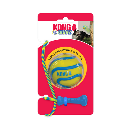 The KONG Wavz Bunji Ball is designed for long-distance fetching fun with a unique bungee rope that combines with a fun and vibrant textured ball. Ideal for long-lasting game of fetch, the KONG Bunji Ball also features an ergonomic handle that provides a better grip for throwing further while having the added benefit of a comfortable underhand toss. The unique ball has raised swirls adding a textured grip for tug and toss play. Easily packable for on-the-needs, this toy also floats for water retrieving play, letting the fun fly further.