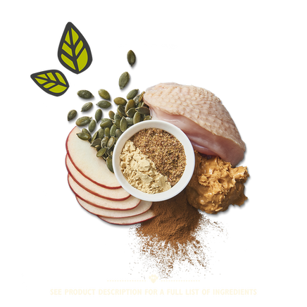 72% Freshly Prepared Chicken, Pea Protein, Glycerin (derived from Rapeseed Oil), 4% Flaxseed, 1% Peanut Butter, 0.2% Apple, Pumpkin Seeds, Cinnamon