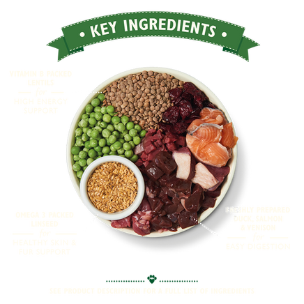 We make this recipe using only freshly prepared duck, salmon and venison- with carefully chosen fruits and vegetables, and our nutritious botanical herbs. This food is also a good source of all the essential vitamins and minerals your dog needs in their daily diet.