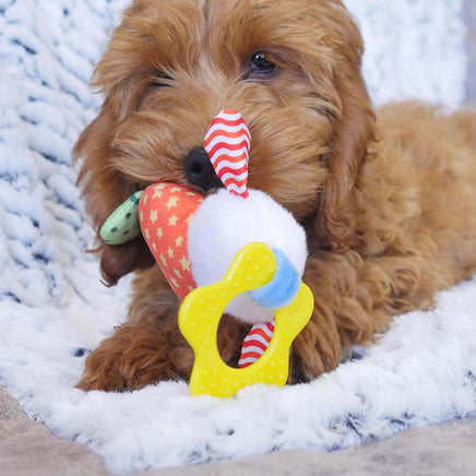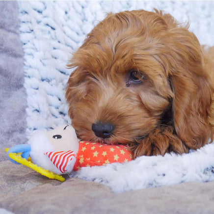 Laughy Lamb is sure to become a firm favourite toy for your perfect pooch. Toys are incredibly important to have accessible to your puppy and young dogs, as they promote the natural behaviours of foraging, exploring, and playing. We all know that puppies love nibbling at anything they can get their paws on, so Larry Lamb comes prepared with a tough biting ring included. As well as promoting positive behaviours, toys also have the capability to reduce excessive barking due to them keeping your dog occupied with such a comforting toy.