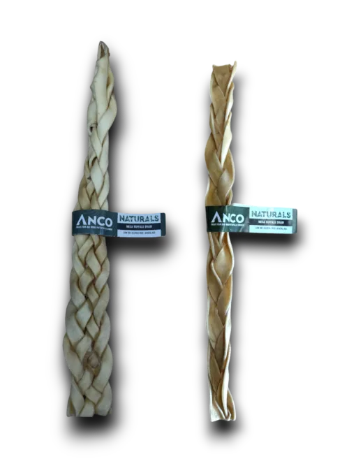 Calling all super chewers for - one of Anco's largest treats - Mega Braids. If your dog is already a fan of our braids, there's nothing much better for them that these. Super long lasting, these are excellent for those enthusiastic chewers. Buffalo is in fact super high in protein and super low in fat! Protein in essential for the building and maintaining of muscles, and for providing them with all the energy they need for walk and play time! While the ultra-low fat content makes them a healthy option, and good for those on a low fat diet or that suffer with pancreatitis. *Approximately 40-50cm* Please note – Anco Mega Braids may come looking like either displayed in the product image. Mega Braids are based on weight, anything above 115g is classed as a Mega Buffalo Braid.