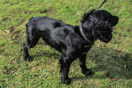 Insert the protective pad into the gusset of the pants and fit them to your dog using the stretchable waist belt, ensuring a snug but not too tight fit.