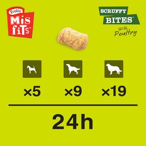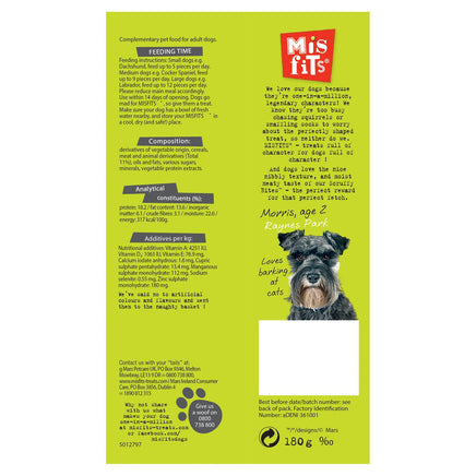 Feeding instructions: Small dogs e.g. Dachshund, feed up to 5 pieces per day. Medium dogs e.g. Cocker Spaniel, feed up to 9 pieces per day. Large dogs e.g. Labrador, feed up to 12 pieces per day. Please reduce main meal accordingly. Use within 14 days of opening. Dogs go mad for Misfits®, go give them a treat.