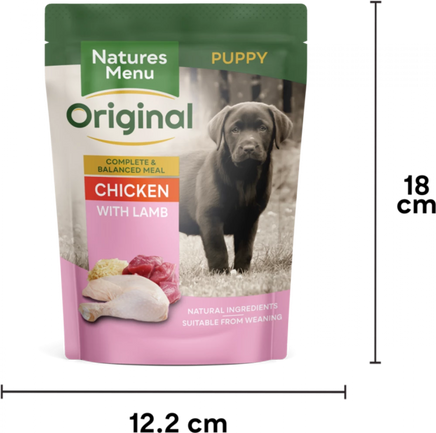 Formulated for young tummies, our cooked, complete and balanced puppy pouches contain 68% real chicken and lamb. Made with whole cuts of chicken and lamb with rice.