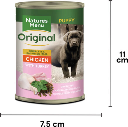 Our high meat, no grain recipe, complete and balanced chicken with turkey puppy food is also suitable as a weaning product.