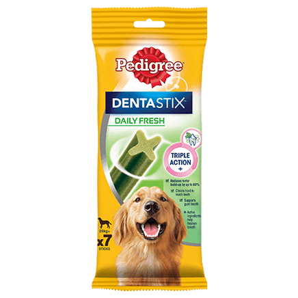 PEDIGREE® DentaStix® Fresh has a unique X shape and, when fed daily, the combination of its special texture and active ingredients, is scientifically proven to help reduce tartar build-up by up to 80%. It also contains a unique active ingredient blend of Green Tea Extract and patented Eucalyptus Oil, when are proven to help freshen breath.
