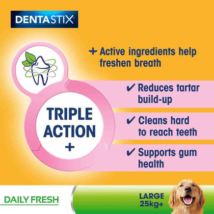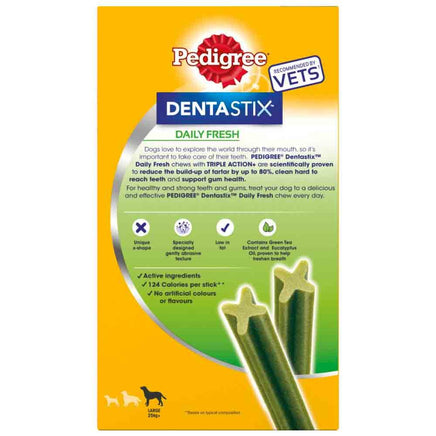 PEDIGREE DentaStix Fresh is designed to be chewed for long enough to be effective. Its gently abrasive texture, combined with active ingredients that work with your dog's saliva, helps reduce the build-up of plaque and tartar. The added Green Tea Extract and Eucalyptus Oil also freshen breath, but it's not just the dental benefits that you can feel good about.