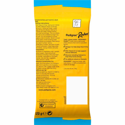 Small dogs (5-9 kg): feed up to 4 sticks per week. Medium dogs (10-24 kg): feed up to 7 sticks per week. Large dogs (25 kg): feed up to 13 sticks per week. Please reduce main meal accordingly. This is chewy treat that is only suitable for dogs 5 kg and over. It is not suitable for young puppies under 4 months. Fresh drinking water should always be available.