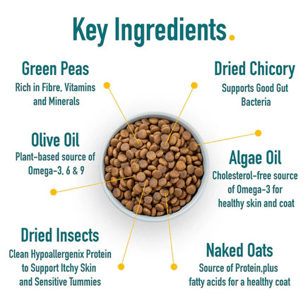 Dried insect protein (26%), Dried potato flakes, Naked oats, Green peas, Vegetable Glycerine, Olive oil, Dried brewer's yeast, Flaxseed, Dried beet pulp, Dried apples, Dried yeast extract, Dried carrots, Dried chicory, Dried chamomile (0.1%), Algae oil, Yucca schidigera.