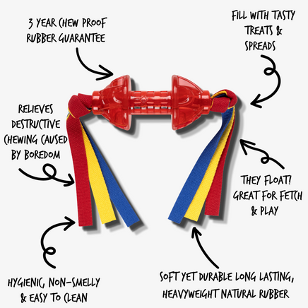 The PetLove Mighty Mutts Tug & Toss Dumbell Rope is chew proof - GUARANTEED!* The super-strength rubber makes the perfect toy for the persistant chewer, and the rope allows for a fun game of chase and tug. They are also hollow so great for poking treats into. Stuff the dumbell full of your dog’s favourite treats and spreads to encourage their natural instinct to chew, believe it or not- it relaxes them. Not only is this a great way to slow down your doggies dinner time, it will also give them a physical and mental workout to help let off some steam, relieve stress and boredom but most importantly- it will make your dog feel happy! 20 minutes with a Mighty Mutt is the equivalent of an hours walk.