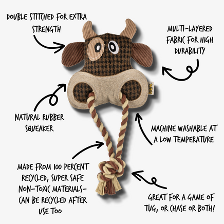The PetLove Wonky Woolies Tuggerz Bull is the perfect toy for dogs who like to play rough and need their toys tough! Our toys are extra durable with double-stitched, multi-layered fabric and so can withstand a high energy game of chase and tug. The Wonky Woolies are also perfect to snuggle up with after a long day. Thats not all- they are made from super safe & non-toxic 100% recycled materials- we are diverting old woollen clothing from landfill to create these eco-friendly dog toys! Once the fun ends, pop them in your recycle bin.