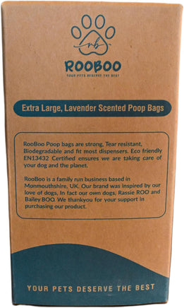 RooBoo 120 Biodegrable Dog Poop Bags are EN13432 Certified and made from PLA, PBAT and Corn Starch, This means they are eco friendly and start to disintegrate after 12 weeks and completely breakdown within 6 months - They come in a convenient single pack and fit most dispensers that you can take with you on walks or when travelling - Subtle Lavender scent that is not overpowering or does not compromise the integrety of strength and quality - These poop bags make it easy to be a responsible pet owner without harming the environment or compromising on quality - Each box contains 8 rolls with 15 bags in each roll.