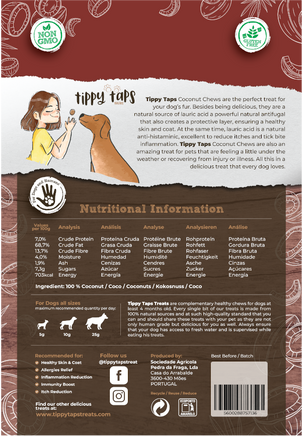Tippy Taps Coconut Chews are the perfect treat for your dog, it’s hard to find a pet that doesn’t like coconut. Besides being delicious, Coconut is a natural source of lauric acid a powerful natural antifungal that also creates a protective layer, ensuring a healthy skin and coat. At the same time, lauric acid is a natural anti-histaminic, excellent to reduce itches and tick bite inflammation. Coconut can be a great snack to include in your pet’s diet. Try feeding them a treat when they are a little under the weather or recovering from injury or illness, they will love you for it.