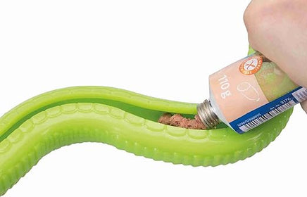An interactive dog treat snake, with a slot for hiding yummy treats or food, which your dog will love. Fantastic for dogs that like to chew, with a squeaky sound and fruity flavour for extra fun at playtime! Ideal for chewy dogs.
