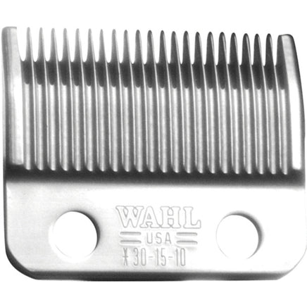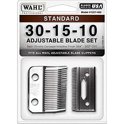 Replacement clipper blade set. Includes No. 30, No. 15, and No. 10 standard satin chrome, corrosion inhibitive finish, adjustable blades. Compatible with all Wahl adjustable clippers.