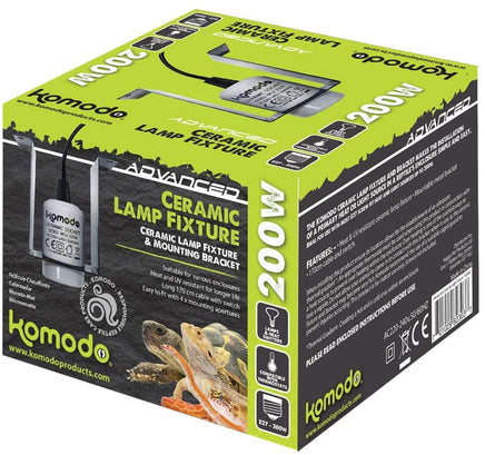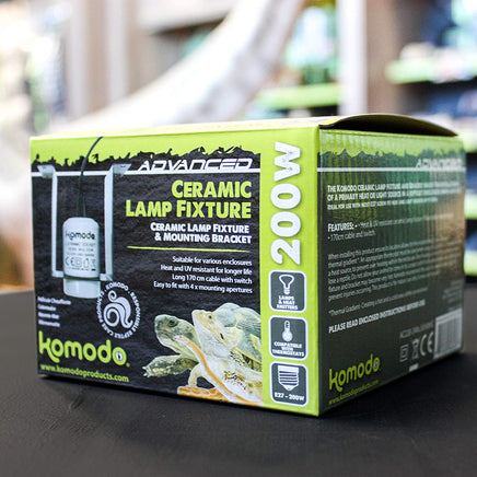 The Komodo Ceramic ES Lamp Fixture and Mounting Bracket makes securely installing heat or light sources within a reptiles environment simple and safe.  Easily mountable, this heat and UV - resistant ceramic lamp fixture is suitable for various enclosures and for use with most E27 screw cap heat and light sources up to 200W. Fitting has an on/off switch and supplied with English plug.