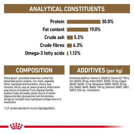 Composition: vegetable protein isolate*, precooked wheat flour, animal fats, dehydrated poultry protein, rice, maize, vegetable fibres, hydrolysed animal proteins, chicory pulp, minerals, fish oil, soya oil, yeasts and parts thereof, tomato (source of lycopene), fructo-oligo-saccharides, psyllium husks and seeds, hydrolysed yeast (source of manno-oligo-saccharides), hydrolysed crustaceans (source of glucosamine), borage oil, marigold extract (source of lutein), hydrolysed cartilage (source of chondroitin).