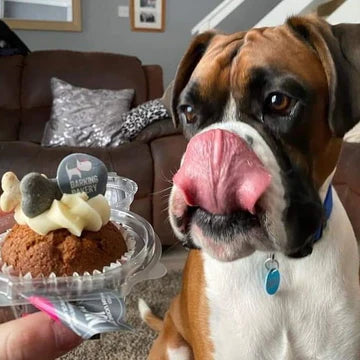 A single Vanilla Iced Carob cake doggy cupcake treat. Something really pawsome. made to share or for the larger of our furry friends... Our light sponge, topped with a tail-swishing swirl of famous yoghurt frosting and decorated with crunchy bone and edible disc in a paw print muffin wrapper.