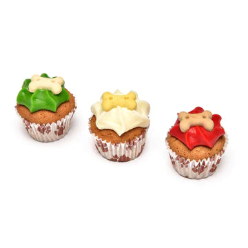 A bite sized Trio of festive mini-iced woofins cupcake treats, two vanilla and one carob sponge each decorated with a dash of our famous yuletide yoghurt topping and finished with a crunchy bone biscuit…