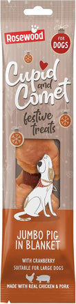 The Cupid & Comet Jumbo Pig In Blanket is sure to be loved by dogs of all shapes and sizes. Jumbo treat features 1 pork sausage wrapped with chicken and a hint of dog-friendly cranberry. The perfect blend of savoury and sweet! The ultimate Christmas snack!