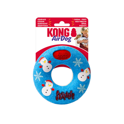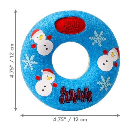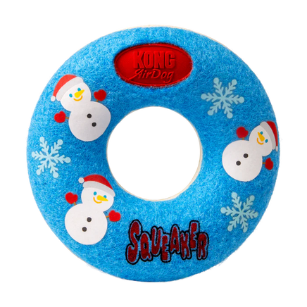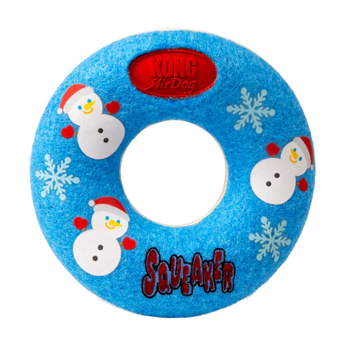 KONG® Holiday AirDog® Donut combines two favorites— a tennis ball and a squeaker—into one fabulous fetch toy to help pups ring in the holidays with tons of fetching fun. KONG Tennis non-abrasive material is softer on teeth than regular tennis ball felt. The squeaker calls dogs to play while the dynamic bounce makes for unpredictable rebounds, rolling and fetching fun with a dog-friendly holiday donut with a hole that makes grabbing easy.