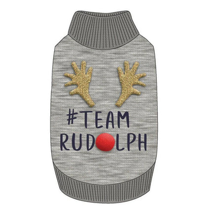 Team Rudolph sweater. Jersey sweater featuring applique team Rudolph and pom pom nose.